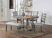 This distinctly shaped table will help you build an outstanding dining space. The gray table top features a hint of warm tone, displaying a diamond wood grain pattern that plays off the cut-out corners. Playing off the same hue is the soft gray linen-like fabric, offering comfortable seating on the matching chairs and bench. The ladder back design shows protrusions on the sides of the chair; it's an element found on both ends of the trestle base as well, a sort of rugged style cleverly complemented by the wire-brushed frames.